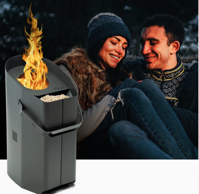 El calefactor de patio a pellet ICON de Amesti está diseñado para entregar una experiencia de calor exterior eficiente, combinando diseño moderno, portabilidad y una llama constante sin humo.